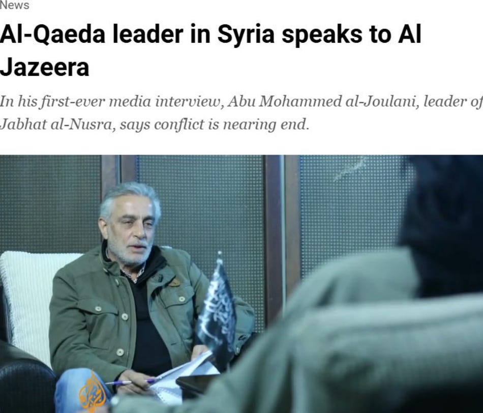 وكانت قناة الجزيرة القطرية، الممولة من الدولة، قد لعبت دورًا محوريًا في تلميع صورة الجولاني، إذ خصّته بمقابلتين حصريتين في عامي 2013 و2015، كانت الأولى من نوعها التي يظهر فيها تلفزيونيًا، ما وفر له غطاءً إعلاميًا مهمًا خلال صعوده السياسي وتبرؤه المعلن من تنظيم داعش.