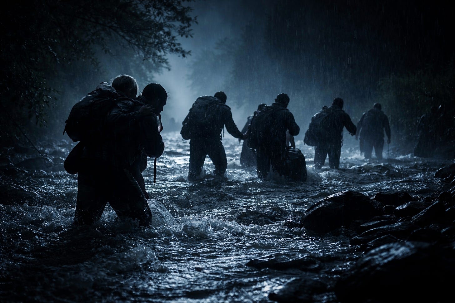 تصف “أم حسن” الرحلة بأنها لحظة انعدام كامل للأمان. انتظار طويل في منزل مهجور، ثم انتقال ليلي على دراجات نارية، وصولاً إلى ضفة نهر متضخم بفعل السيول. “المياه كانت أقوى من قدرتنا على الوقوف. خطوة خاطئة تعني الغرق”، تقول.