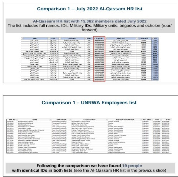 ويؤكد التقرير أيضاً أن ما لا يقل عن 18 موظفاً في الأونروا شاركوا بشكل نشط في الهجوم، استناداً إلى مواد تم ضبطها من العدو، وأدلة جغرافية وتقنية واتصالات ولقطات من كاميرات المراقبة.